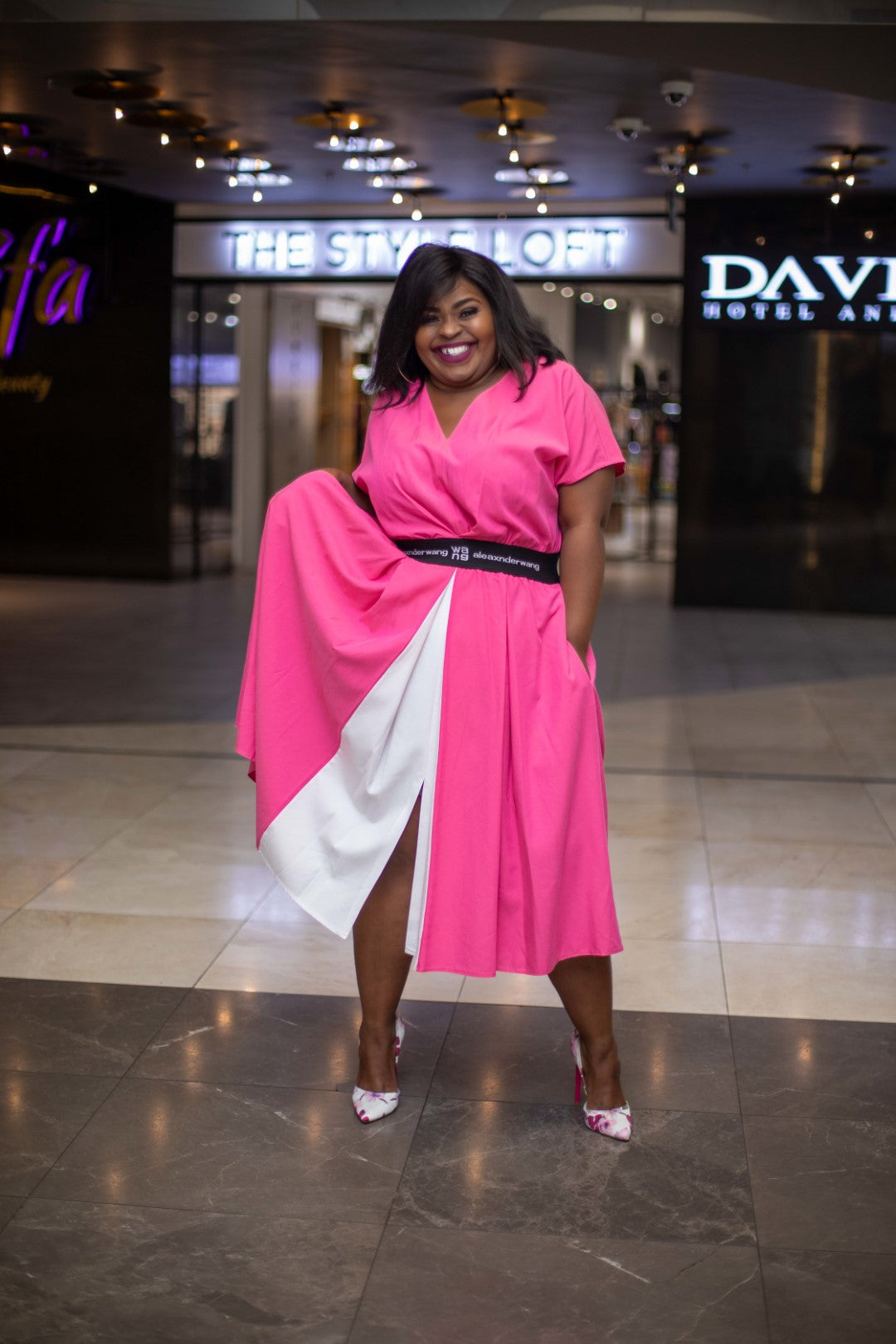 This pink maxi dress is elegantly designed with a black waistband that defines your figure. It also features a striking white pleated slit in the front for a touch of sophistication and a playful hint of contrast