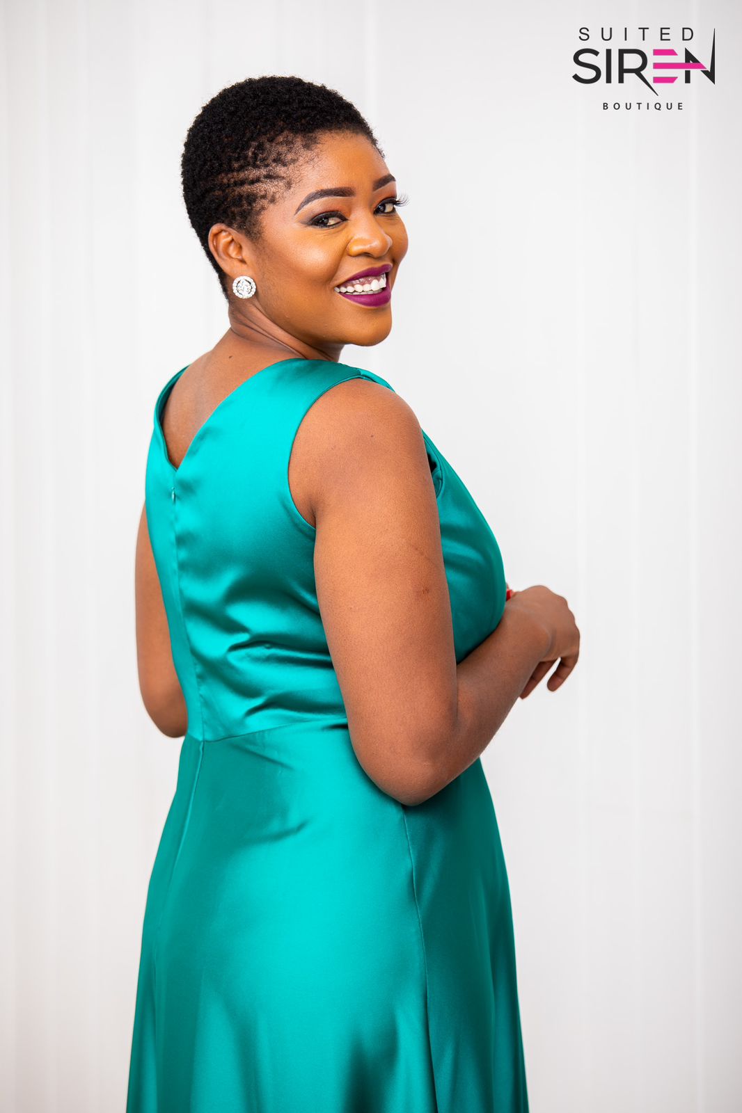 The rich, vibrant green hue adds a touch of boldness while maintaining sophistication. The dress features a sleek side slit that reaches the ankle, offering a glimpse of the leg in a refined yet daring way. The silhouette is beautifully tailored, hugging the body at the top and gently cascading to the floor, creating a graceful, elongating effect. Perfect for a formal affair, this gown combines timeless elegance with a hint of modern allure.